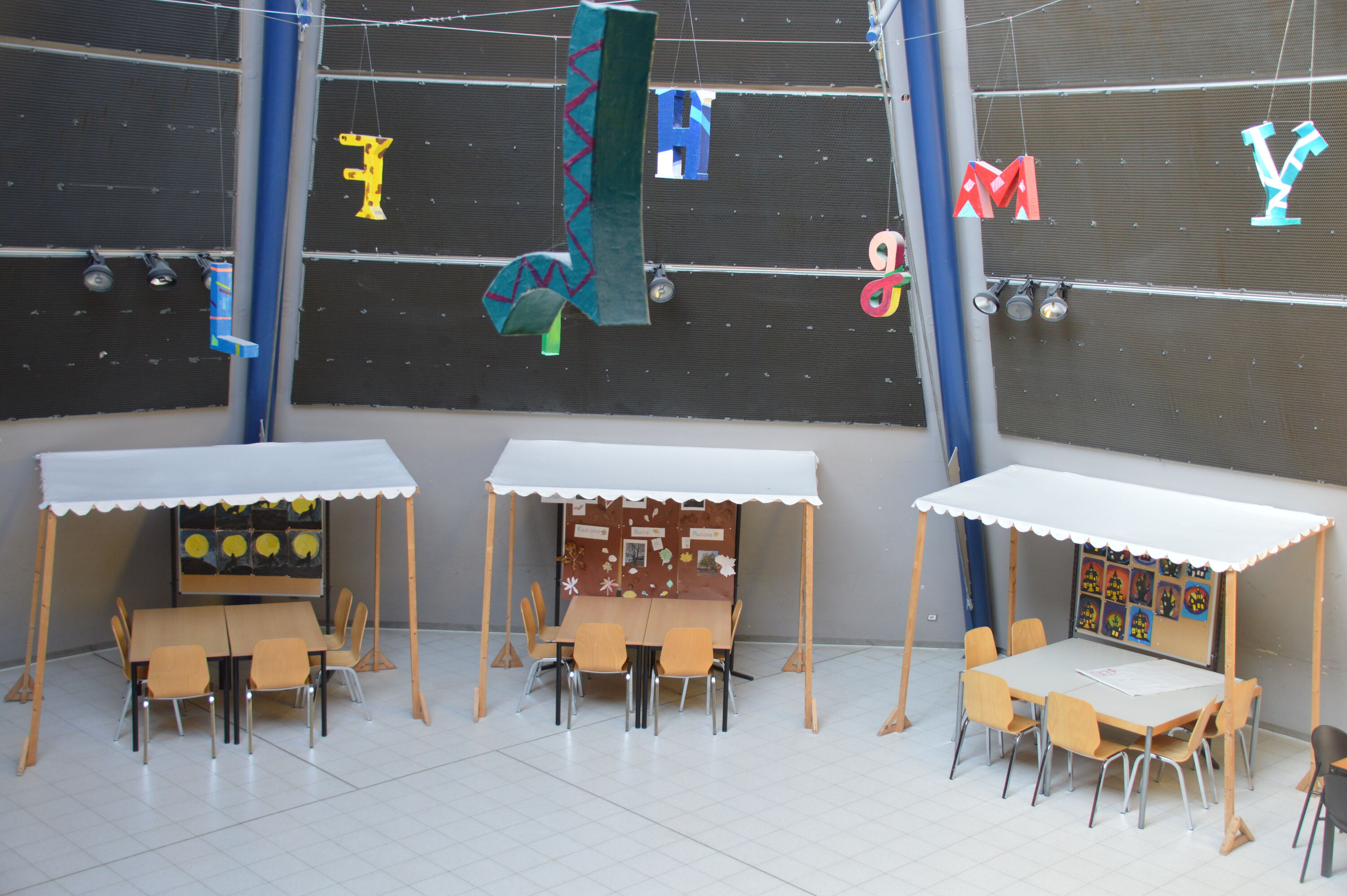In Klausdorf ist unser Hauptstandort. Hier sind die Jahrgänge drei- bis vierzügig. Es gibt einen großen Schulhof, eine Bücherei, einen Forscherraum, einen Musikraum, einen Technikraum, eine eigene Sporthalle sowie eine Küche. In der Aula der Pyramide ist genug Platz für Versammlungen, wie unser "Show & Tell" oder Sitzgelegenheiten zum individuellen Lernen.